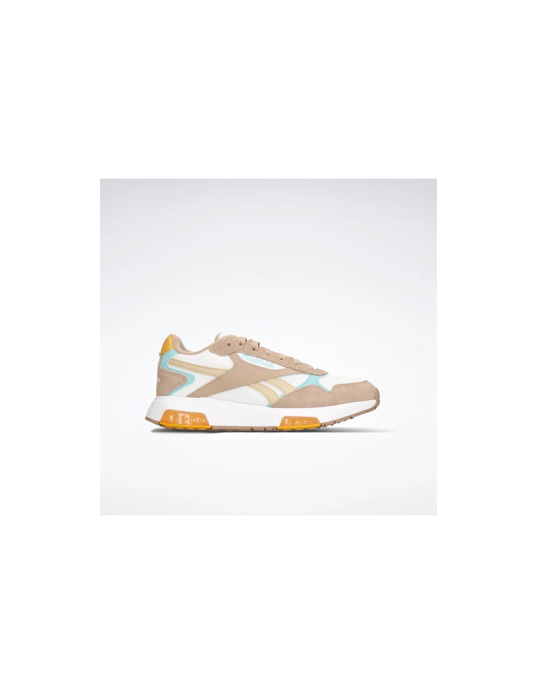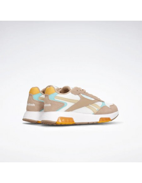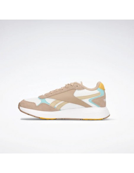 Las zapatillas Glide están adornadas con detalles clásicos de Reebok, como las rayas laterales y los logos retro. También cuentan con la característica suela ondulada actualizada con tecnología DMX, que mueve el aire entre la parte delantera y la posterior para amortiguar cada paso.